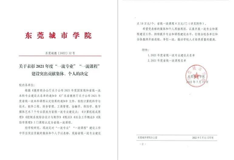 近日,beat365英国官方网站印发了《关于表彰2021年度“一流专业”“一流课程”建设突出贡献集体、个人的决定》(东莞城教[2022]32号)。《决定》对学校省一流专业建设点、一流课程的集体和个人进行表彰。这是继去年beat365官网对国家和省级一流专业建设点重奖之后的又一次重奖。