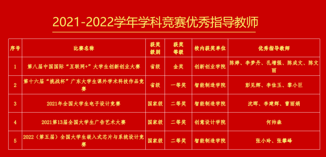 2021-2022学年度,学校科研工作不断突破,获批1个省级科研平台和1个广东省博士工作站,获批3个市级科研平台(2个重点实验室、1个工程中心),学校在高水平论文发表,横纵向项目,知识产权等方面,均较上一学年都有较大提高。2021-2022 学年度,学校何帅、江义火、赵书山、李康顺、陈妹琼等5位老师获评为“2021-2022年度科研优秀个人”。学校对每名科研优秀个人奖励10000元,共计50000元。