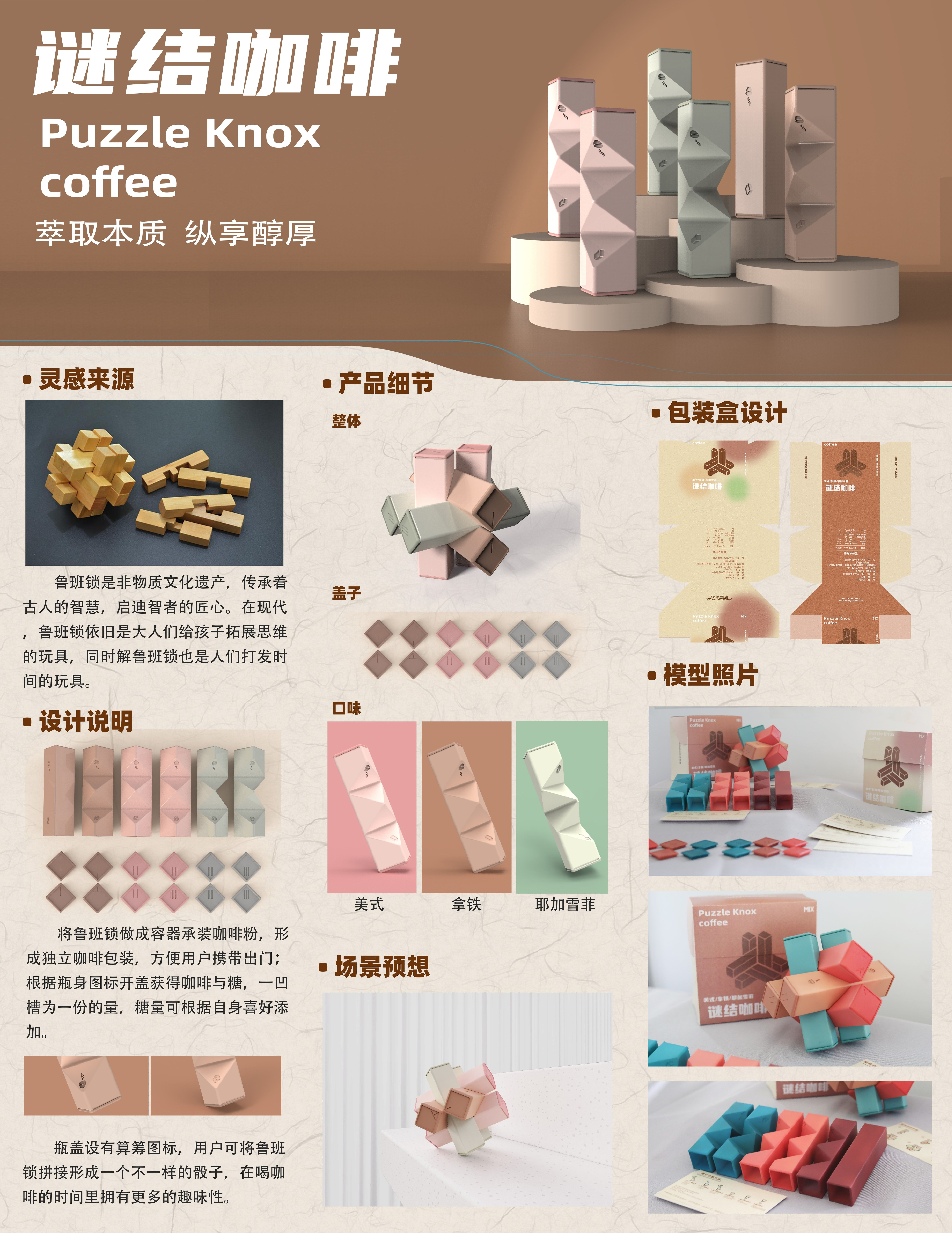 将鲁班锁做成容器承装咖啡粉,形成独立咖啡包装,方便用户携带出门;根据瓶身图标开盖获得咖啡与糖,一凹槽为一份的量,糖量可根据自身喜好添加。