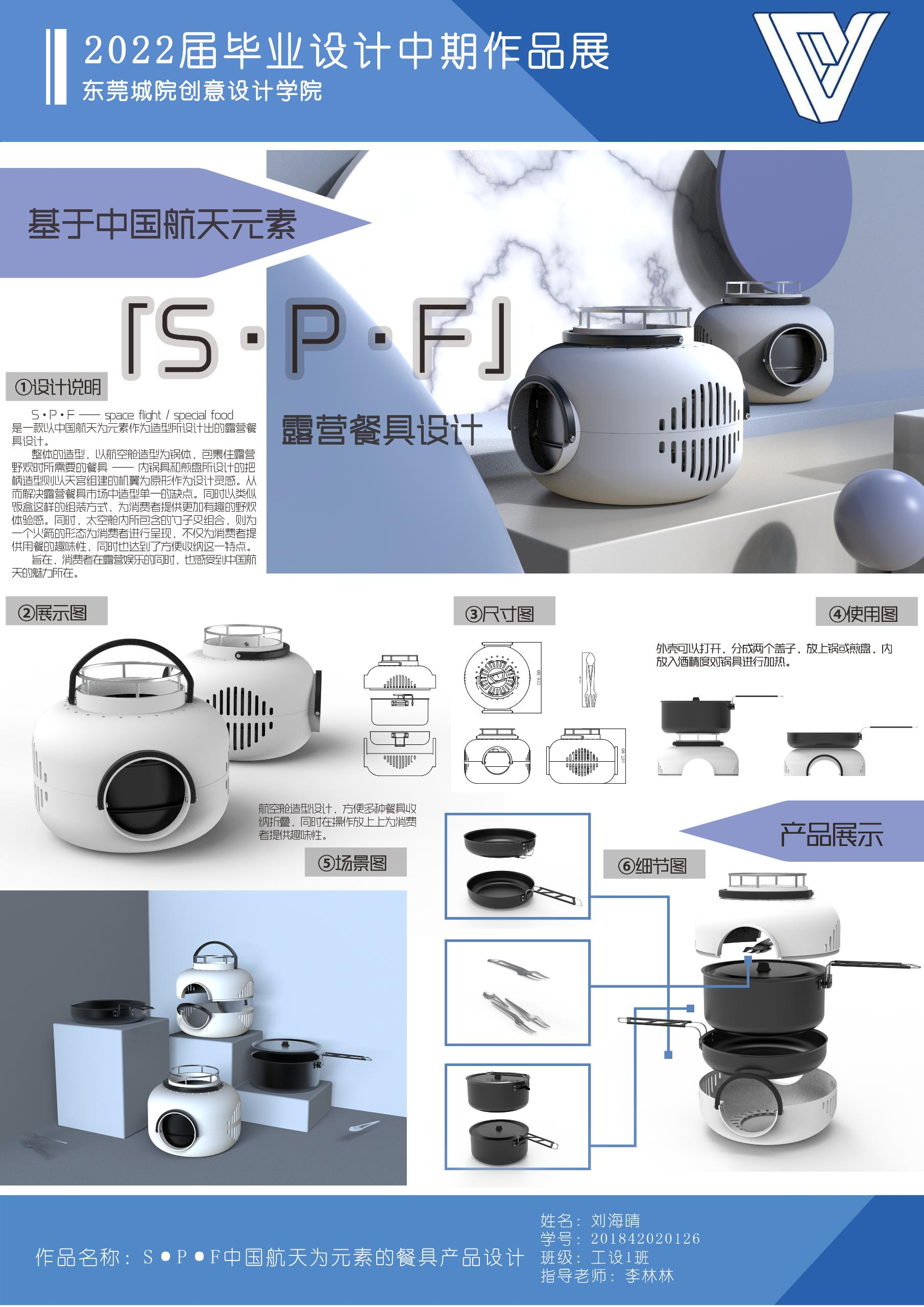 S• P • F —— space flight / special food 是一人中国航天为元素作为造型所设计出的露营餐具设计。 整体的造型,以航空舱造型为锅体,包裹住露营野时所需要的餐具、内锅具和煎盘所设计的把柄造型则以人天宫组建的机翼为原形作为设计灵感而解决露营餐具市场中造型单一的缺点。同时以类似饭盒这样的组装方式,为消费者提供更加有趣的里野炊体验感。同时,太空舱内所包含的筷子叉组合,则以火箭的形态为消费者进行呈现,不仅为消费者提供用餐的趣味性,同时也达到了方便收纳这一特点。 旨在,消费者在露营娱乐的同时,也感受到中国航天的魅力。