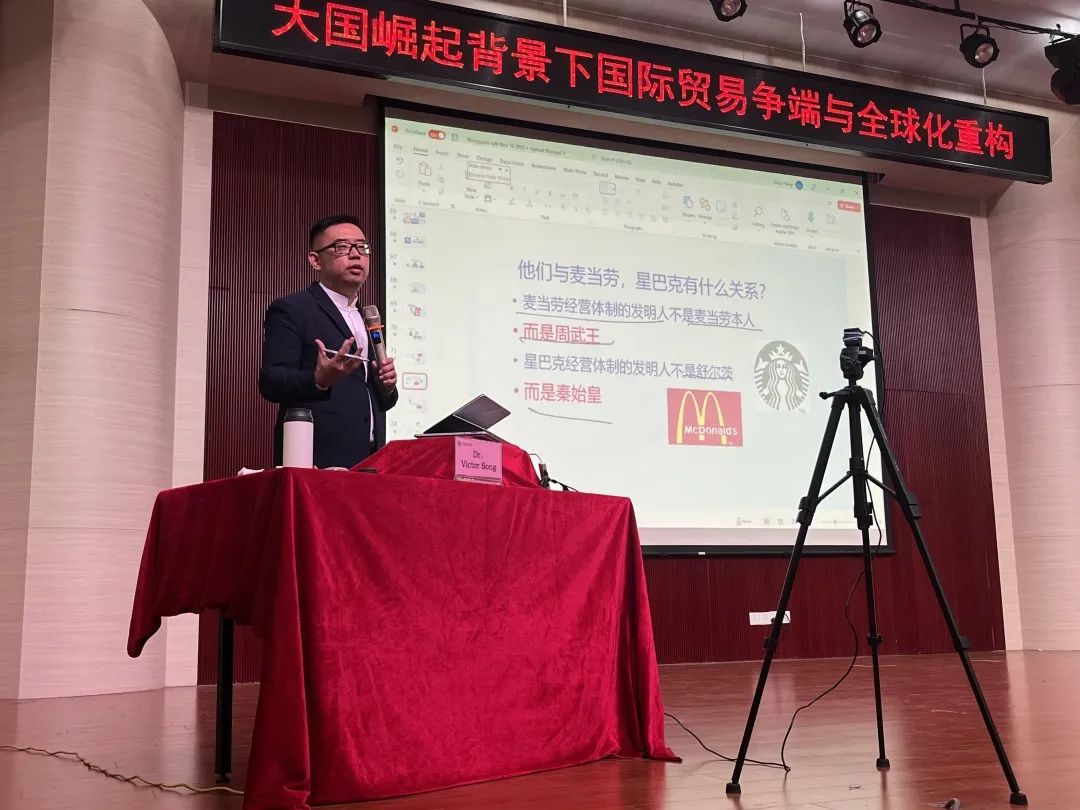 随后,Dr. Victor Song通过经济学与历史、哲学、甚至物理和生物知识的结合,就中美贸易关系及国际贸易未来发展进行了精彩的讲座。Dr. Victor Song为我们解读了美国为什么和中国有贸易逆差,中美贸易逆差的表象和本相,以及美国为什么要迫使人民币升值,升值后逆差加大,为什么还要人民币升。除此之外,讲座以中国外汇储备与美国国债为背景,由浅入深地分析了美国三位总统的对华贸易政策并共同展望中国应对之策。讲座最后,Dr. Victor Song与beat365官网教师进行了现场互动与答疑,为在座来宾奉上了一场酣畅淋漓的精神盛宴。