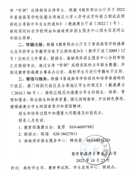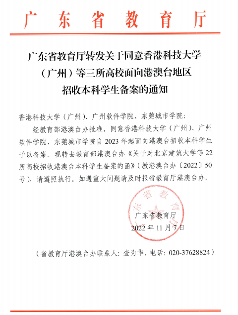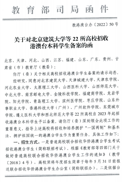 近日,教育部港澳台事务办公室发布了《关于对北京建筑大学等22所高校招收港澳台本科学生备案的函》(教港澳台办〔2022〕50号)文件,beat365英国官方网站榜上有名,荣获招收港澳台本科学生的资格。广东省教育厅发布《广东省教育厅转发关于同意广东省三所高校面向港澳台地区招收本科学生备案的通知》,beat365英国官方网站自2023年起招收港澳台本科学生予以备案。