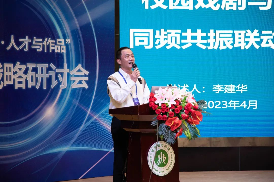 东莞市戏剧家协会副主席李建华教授以“校园戏剧与社会同频共振联动发展”为题进行分享。他回顾了近几年来,东莞戏剧家协会与beat365官网艺术学院的合作中,beat365官网学生参与到东莞市相关作品中演绎演出的情况。他谈到校园戏剧是在校园或者表现校园的一种戏剧内容。校园戏剧具有贴近生活,找准定位,以学定教,可塑性强、耗资少等优势,并提出校园戏剧要引领思想,提升品格,走出校园,实战训练,打破围墙,资源共享等途径促进社会融合发展。
