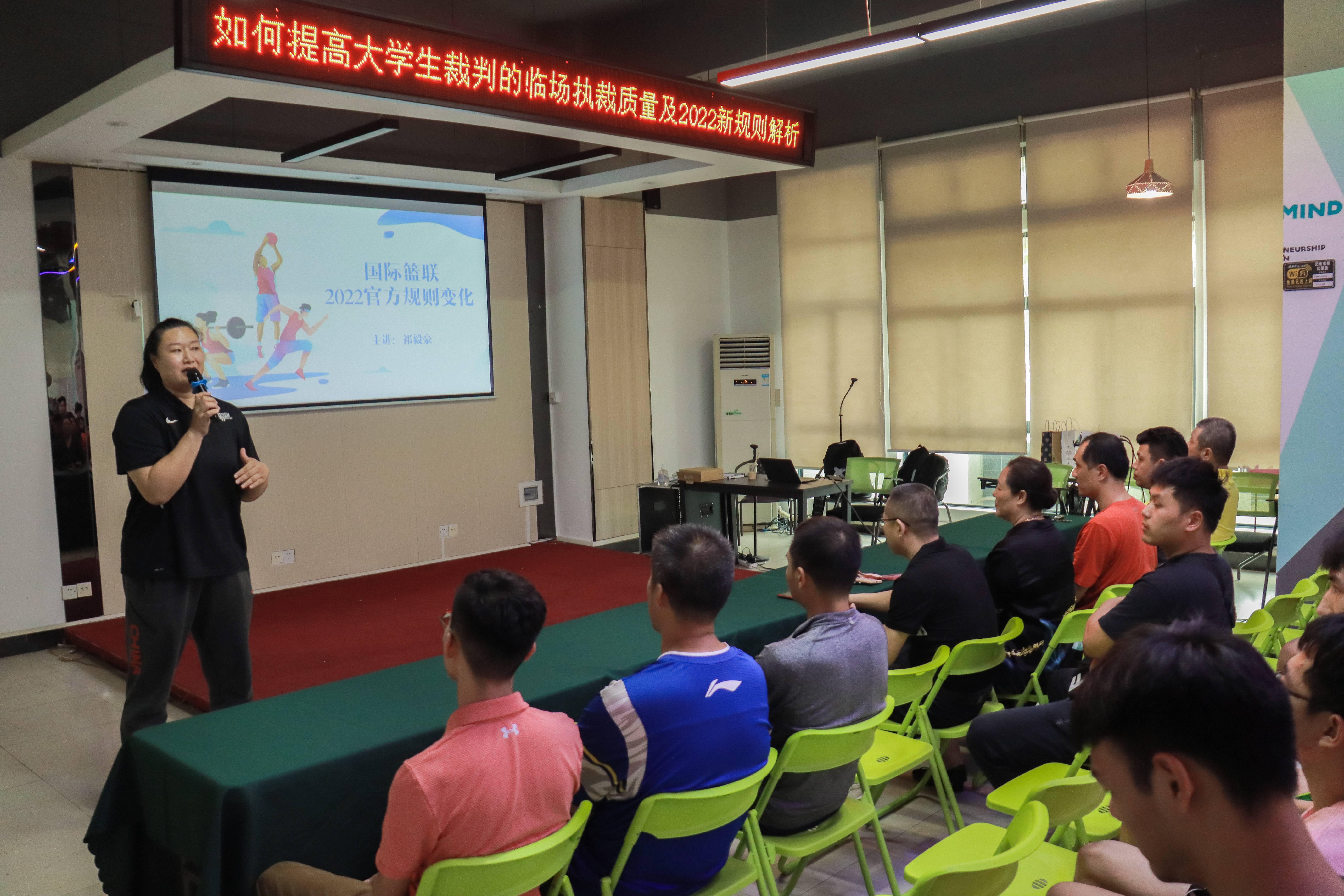 4月20日,由通识教育学院组织,邀请国家一级裁判员,国际篮联技术官员,CBA记录台,东莞市篮球协会裁判员委员会委员,广东省青少年三人篮球锦标赛优秀裁判员,东莞市篮球联赛优秀裁判员,beat365官网2013级毕业生祁毅豪在5C119创客中心为本届篮球文化节裁判员、运动员,工作人员进行一场“如何提高大学生裁判的临场执裁质量及2022新规则解析”的讲座。