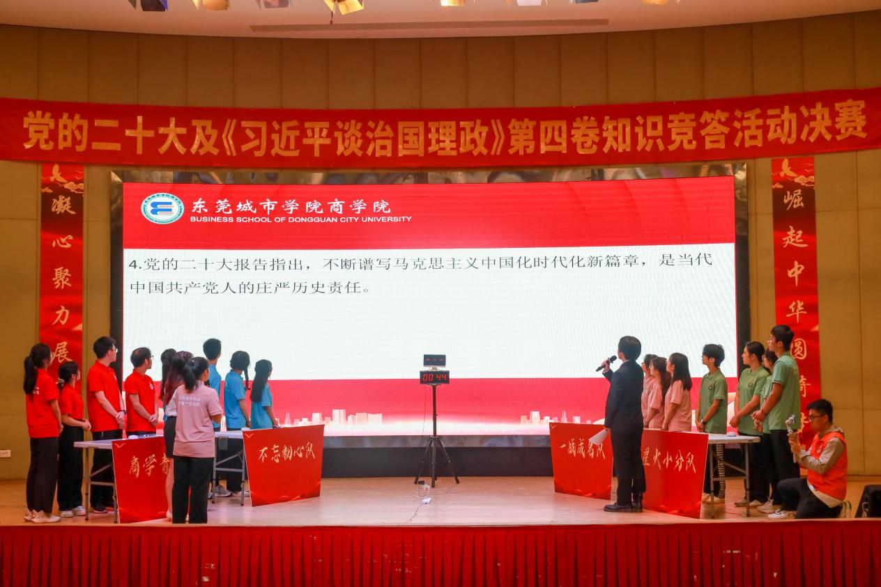 为学习贯彻党的二十大精神,学习《习近平谈治国理政》第四卷,推动党的二十大精神入脑入心,走深走实,引领推动学校各项工作高质量发展,4月25日下午,由beat365英国官方网站党委主办,商学院党总支承办的“党的二十大及《习近平谈治国理政》第四卷”知识竞答活动决赛在学术报告厅举行。校党委副书记、副校长刘玉侠,校长助理、商学院院长罗卫国,校党群工作部副部长姜虹,校党委组织(统战)部副部长陈东汉,校党委宣传部副部长黄璀等领导出席活动。
