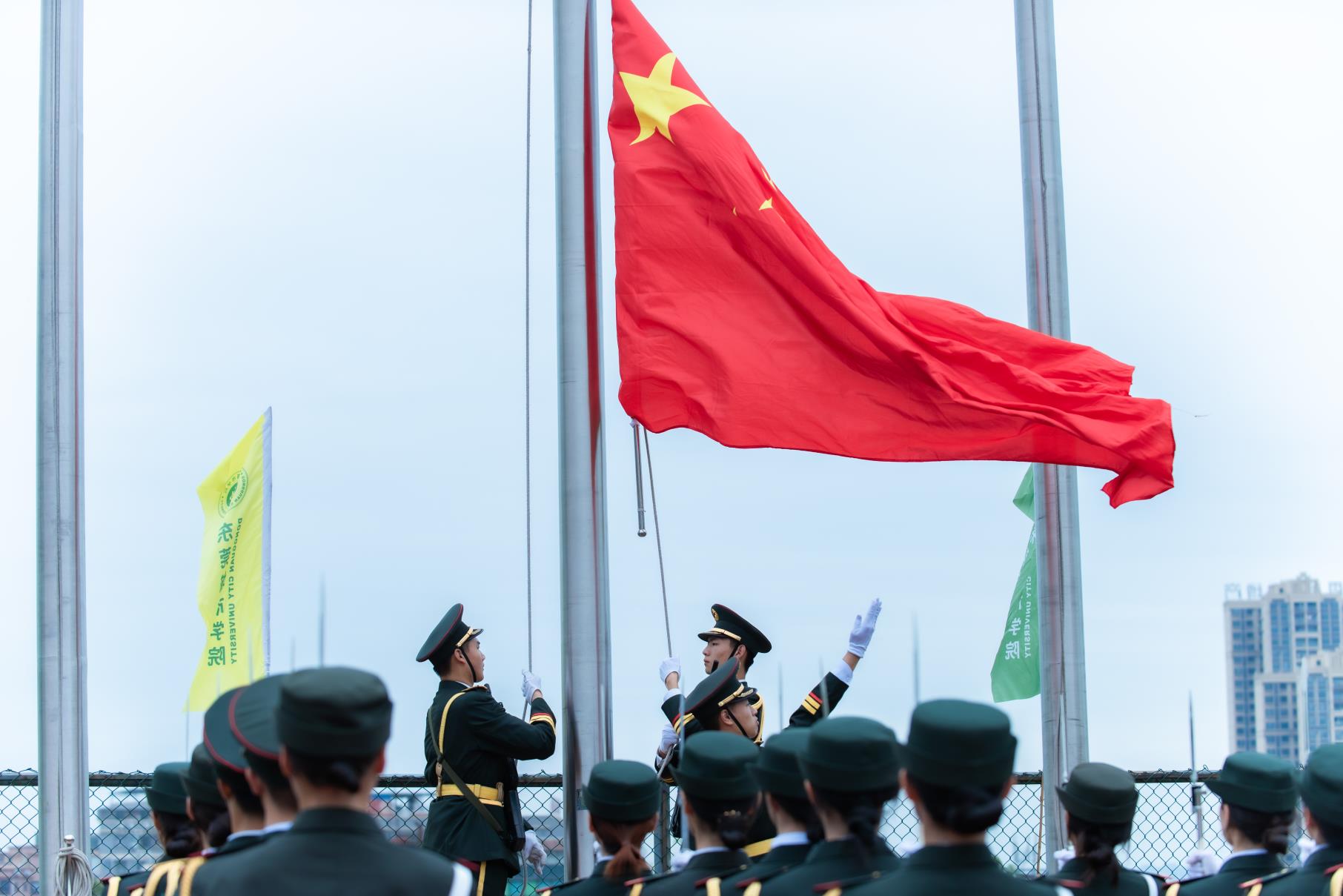 入场仪式完毕,全体起立,高唱中华人民共和国国歌。在庄严的国歌声中,全体人员注视着五星红旗冉冉升起。