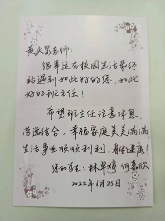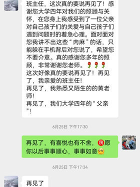 黄老师以真心对待学生、服务学生,春种一颗粟,秋收万粒子。在学生们的心里,黄老师不仅是老师,更是挚友。虽然许多人已经离开了校园,但是会邀请黄老师参加婚礼、会与他分享自己的创业历程、会每学期坚持回校看望黄老师......古往今来,太多太多赞美的话语用在我们心目中好老师的身上,但是千言万语都比不上学生心中对老师的深深挂念。