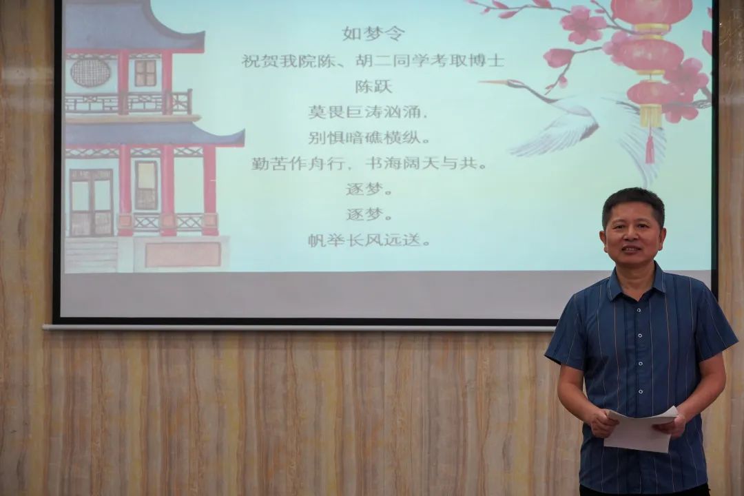 随后,中文系专任教师陈跃作为两位校友曾经的班主任兼任课老师,向在座的教师介绍了两位校友的基本情况和考博情况。他指出,胡越余和陈新在beat365英国官方网站期间就非常努力,制定学习目标并具备高效的执行力,在本科阶段成绩优异。不仅如此,两位校友在研究生院校期间和班主任保持着紧密的联系,教师陈跃不断给予他们学术上的指导和支持,帮助他们提高自己的能力和水平,老师的付出和支持让两位校友得以快速成长和取得优异的成绩。