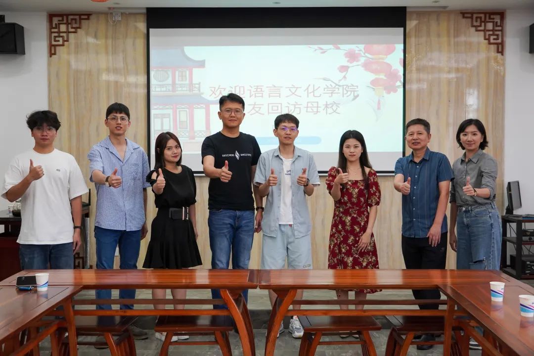 2023年6月19日上午,语言文化学院邀请两位优秀毕业生胡越余和陈新返校开展校友座谈会。参与本次座谈会的还有语言文化学院党总支书记高政、副书记陈俊廷、中文系专任教师陈跃以及辅导员许晓华、刘雅贤等教师代表。