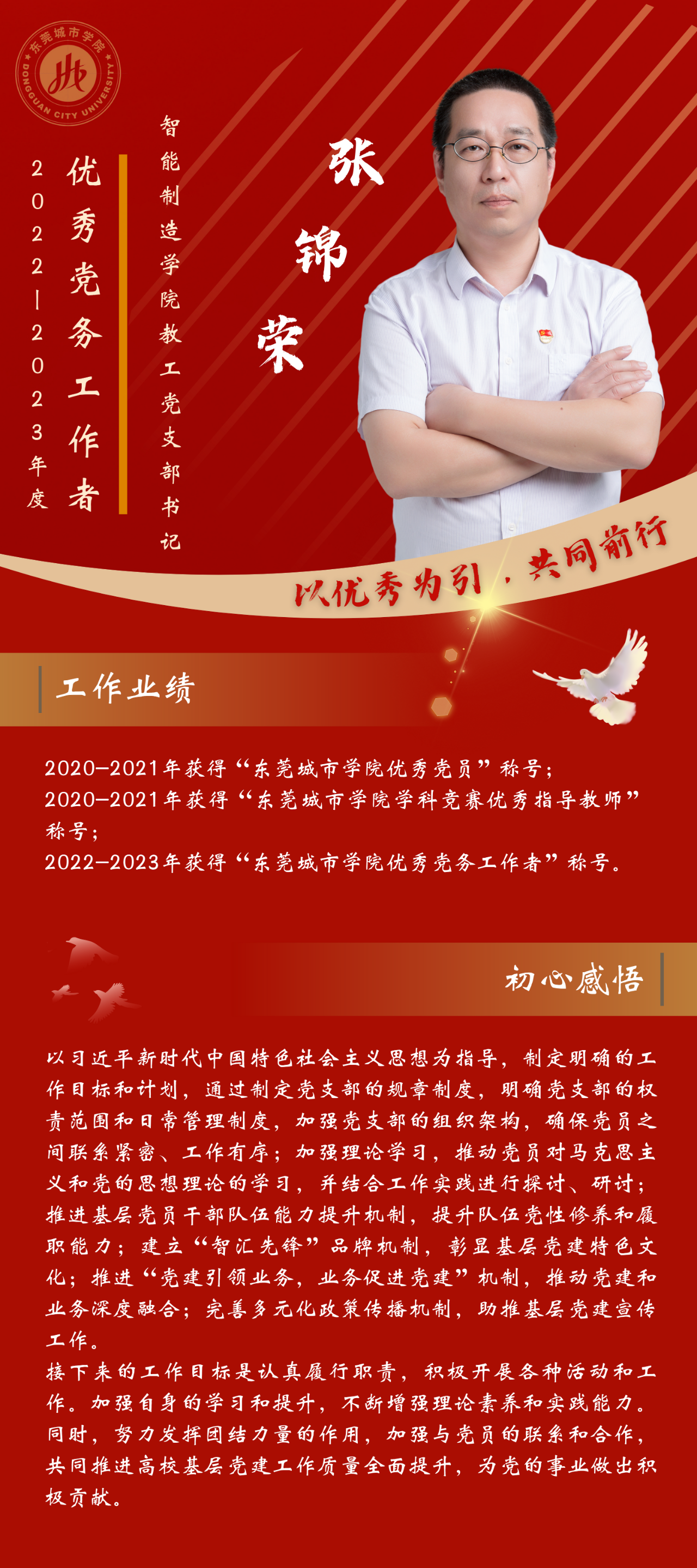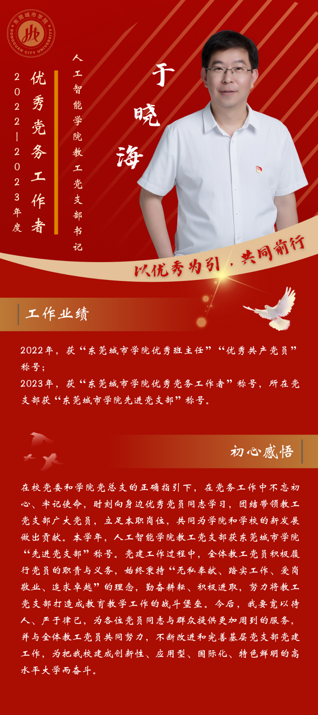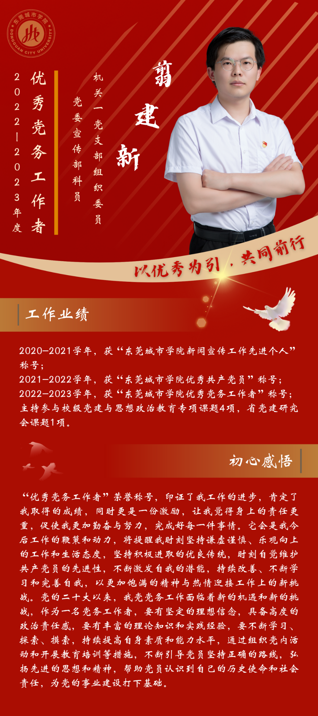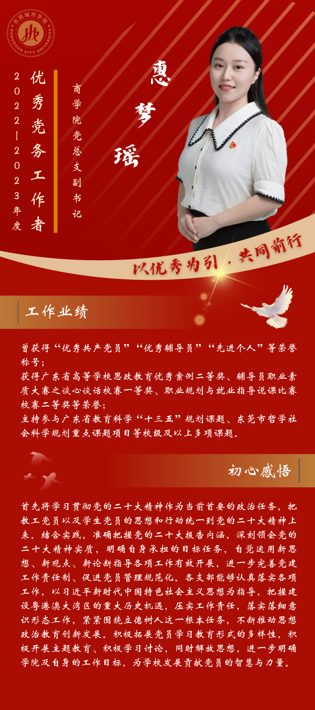 一名党员,就是一面旗帜。为发挥先进典型的示范作用,弘扬党的光荣传统和优良作风,我们推出“优秀党务工作者”风采展,充分展示beat365官网广大党员干部坚守初心使命、勇于担当作为的政治本色。让我们向优秀学习、向先进看齐,在新时代新征程中展现新作为新担当,不断开创学校教育事业发展新局面。