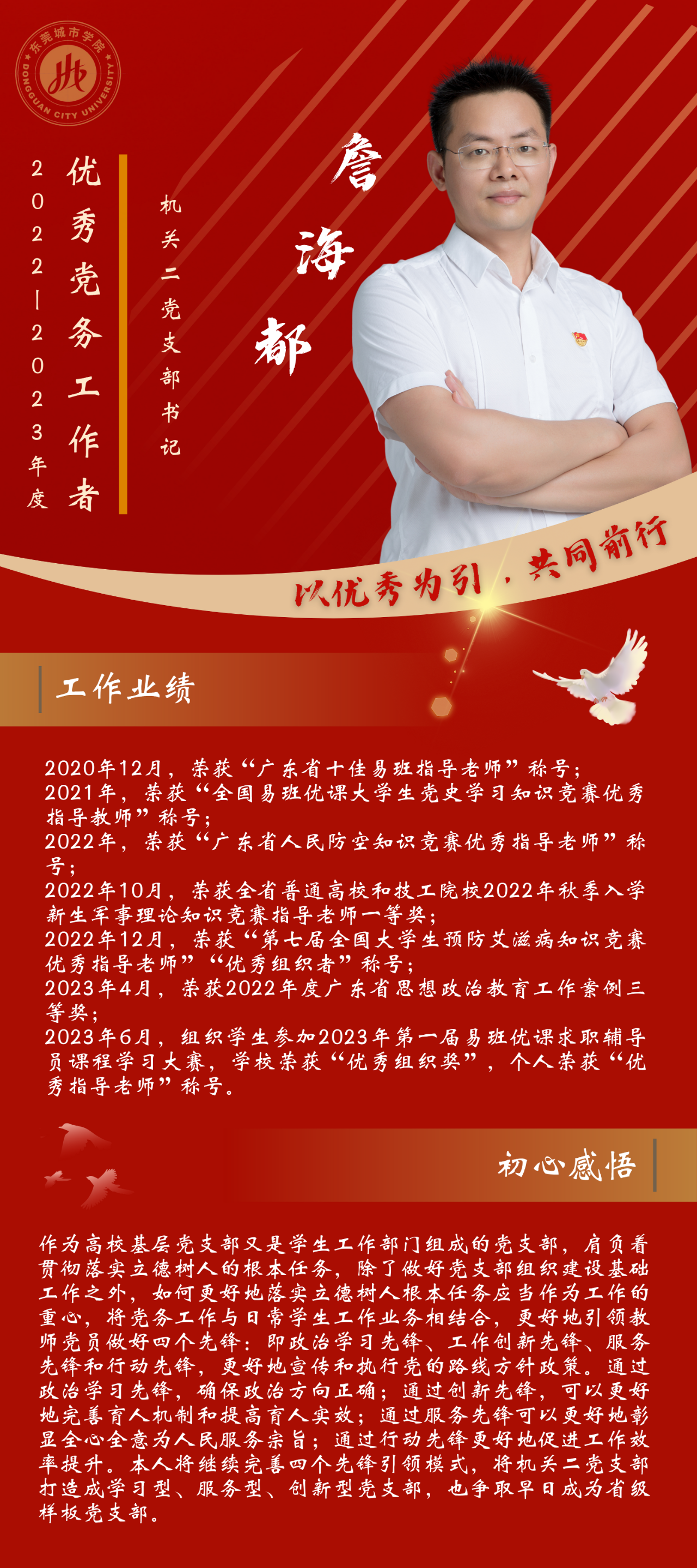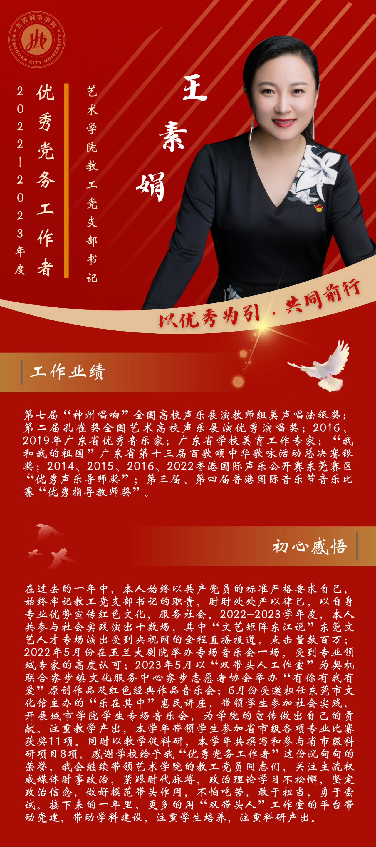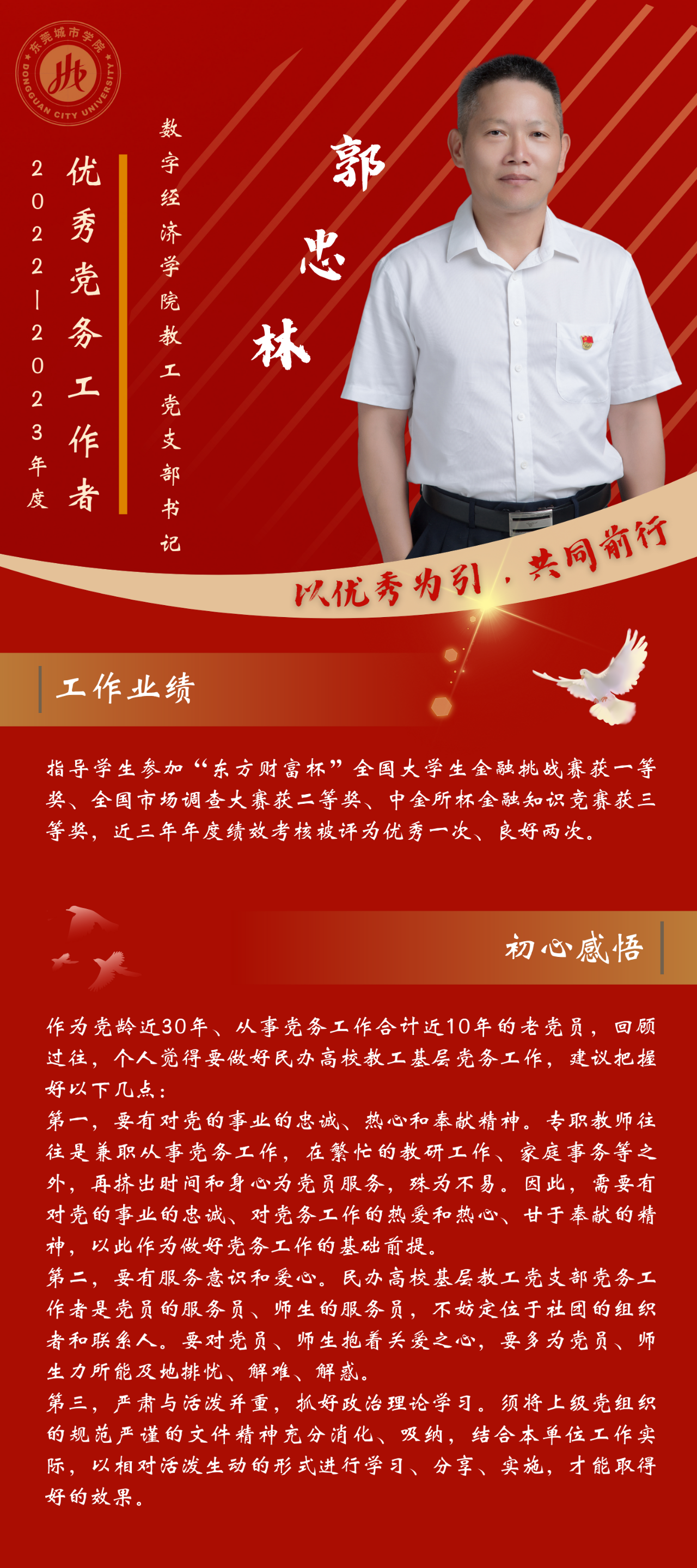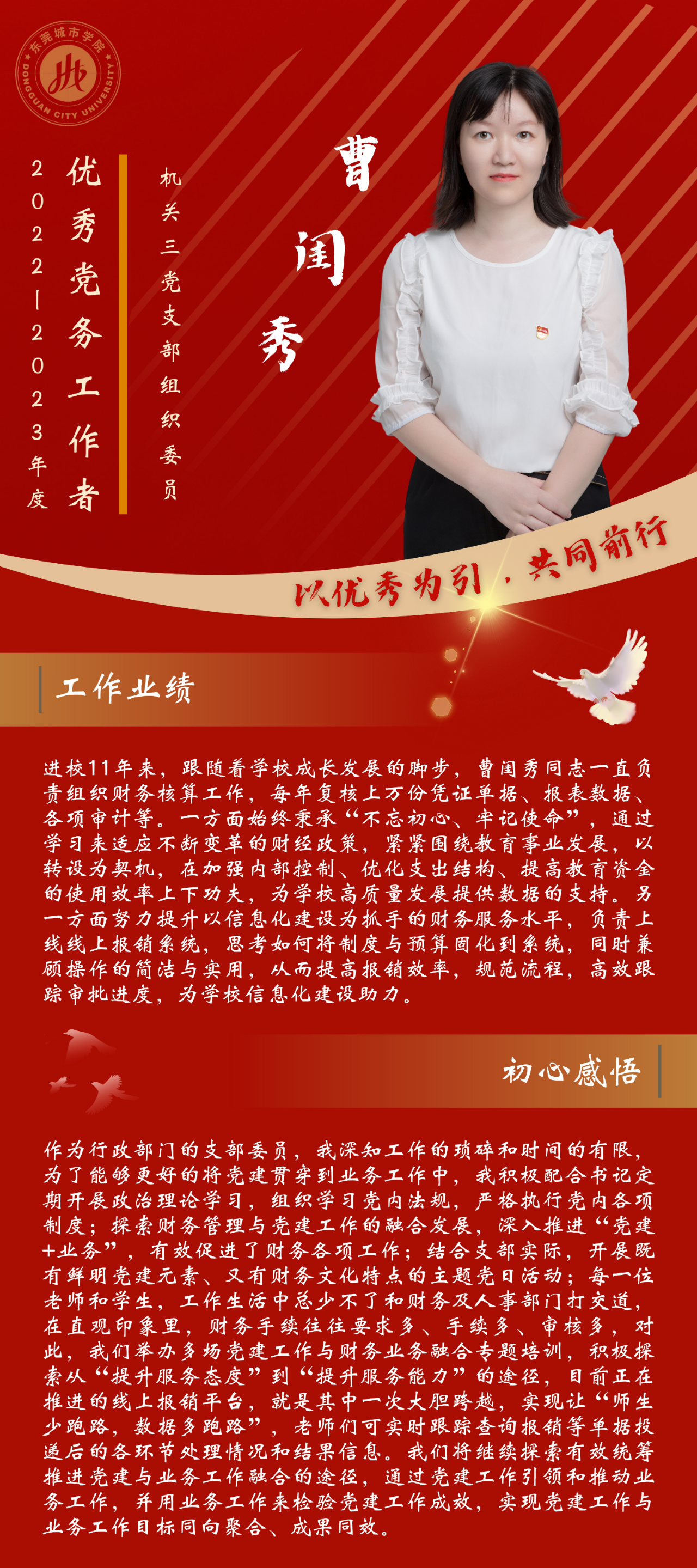 一名党员,就是一面旗帜。为发挥先进典型的示范作用,弘扬党的光荣传统和优良作风,我们推出“优秀党务工作者”风采展,充分展示beat365官网广大党员干部坚守初心使命、勇于担当作为的政治本色。让我们向优秀学习、向先进看齐,在新时代新征程中展现新作为新担当,不断开创学校教育事业发展新局面。