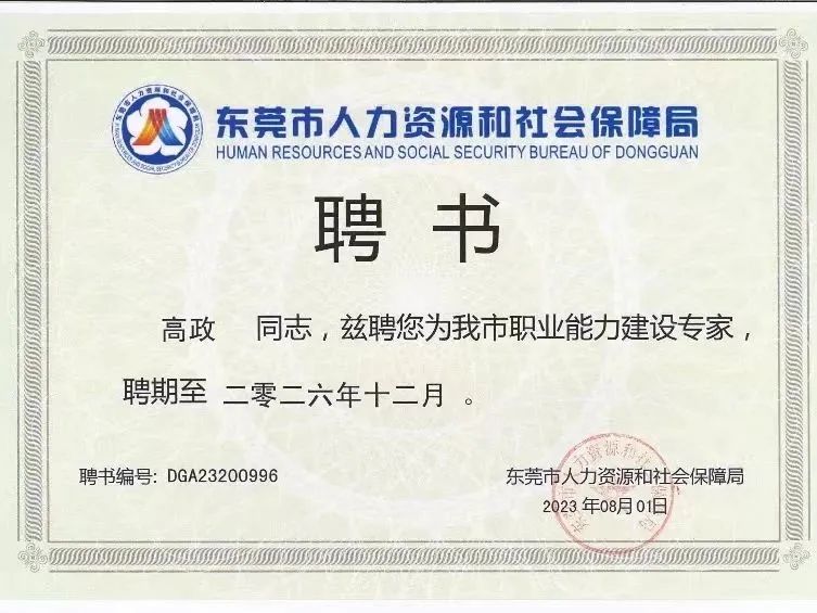 近日,beat365官网语文学院党总支书记高政受聘于东莞市人力资源和社会保障局职业能力建设专家库,担任职业能力建设专家。职业能力建设专家,是指为协助开展职业技能培训、技能人才标准制定、考核评价、职业等级认定、督导检查、日常监管、课题研究、咨询论证及其他职业技能相关工作而设立的职位。专家主要工作有:参与职业能力领域相关研究工作;承担职业能力制度建设、方案及标准拟定,起草各类技能规范;承担工艺技术攻关、设备改造、技能人才培育项目的专家咨询指导工作;承担有关职业建设领域的成果评审、人才评审、项目评审等工作。