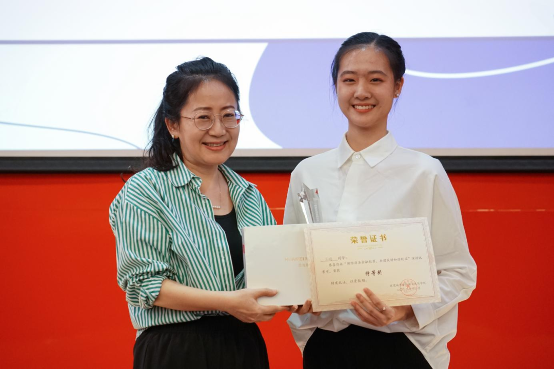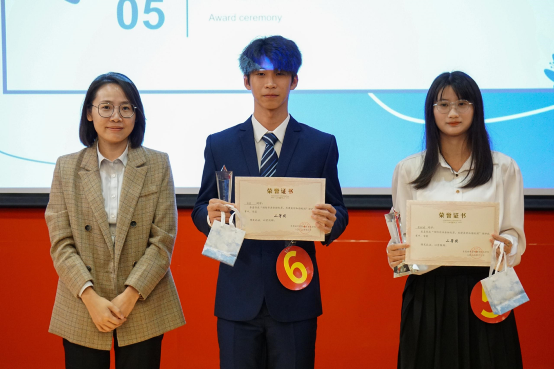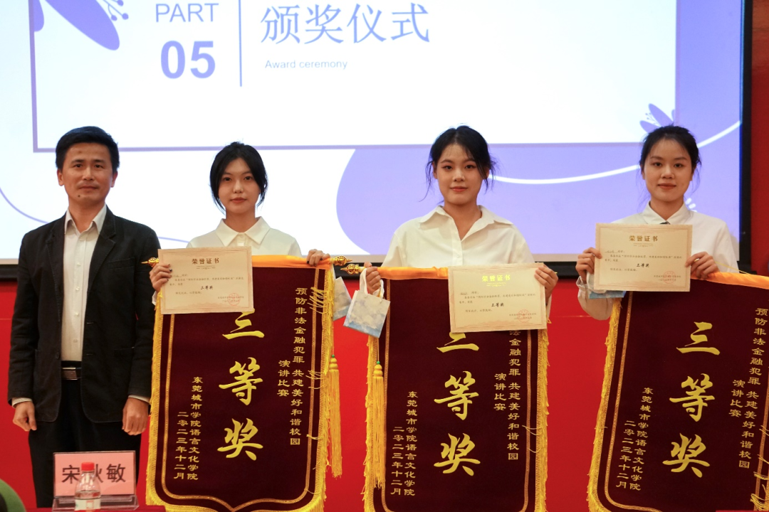 在郭戈老师讲话结束后,主持人宣读比赛结果,获得特等奖是23级会计2班兰玥,获得一等奖有23级汉语言文学8班的李雯,23级商务英语1班卓依雯,获得有二等奖23级网络与新媒体5班卢祺,22级汉语言文学7班黄柳婷,获得三等奖的有23级英语专升本3班龙玉婷,23级法学6班张凡乐,22级视觉传达设计2班王玥涵。分别由语言文化学院名誉院长宋秋敏、党总支书记高政、东莞银行总行合规部高级法律合规师曾丽敏、评委老师有东莞银行总行反洗钱中心主管王栋良、为获奖学生颁奖并与其合影留念。