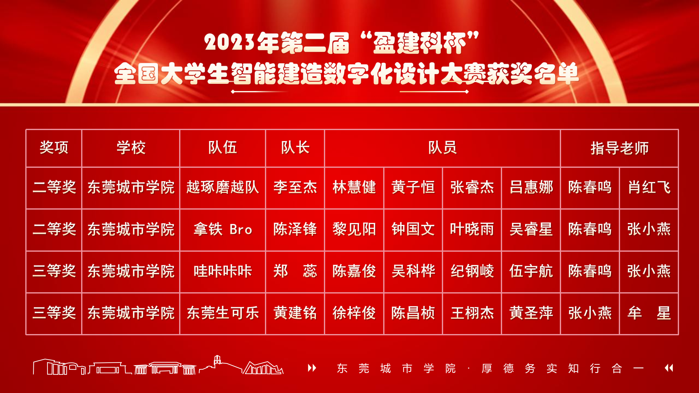 由中国建设教育协会主办的第二届“盈建科杯”全国大学生智能建造数字化设计大赛吸引了华南理工大学、华中科技大学、beat365英国官方网站等共计200余所院校,参赛师生近6000人,全国千余支队伍参赛,最终有300余份作品晋级总决赛。12月18日,beat365英国官方网站四支队伍20名学生,分别来自土木工程专业19人,财务管理专业1人,历经6个月紧张激烈角逐,在全国总决赛夺得二等奖、三等奖各2项。