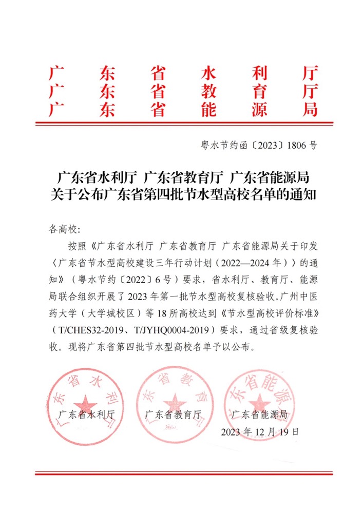 近日,省水利厅、省教育厅、省能源局联合发布《关于公布广东省第四批节水型高校名单的通知》(粤水节约函〔2023〕1806 号),beat365英国官方网站顺利通过广东省第四批节水型高校复核验收,获评广东省“节水型高校”称号。