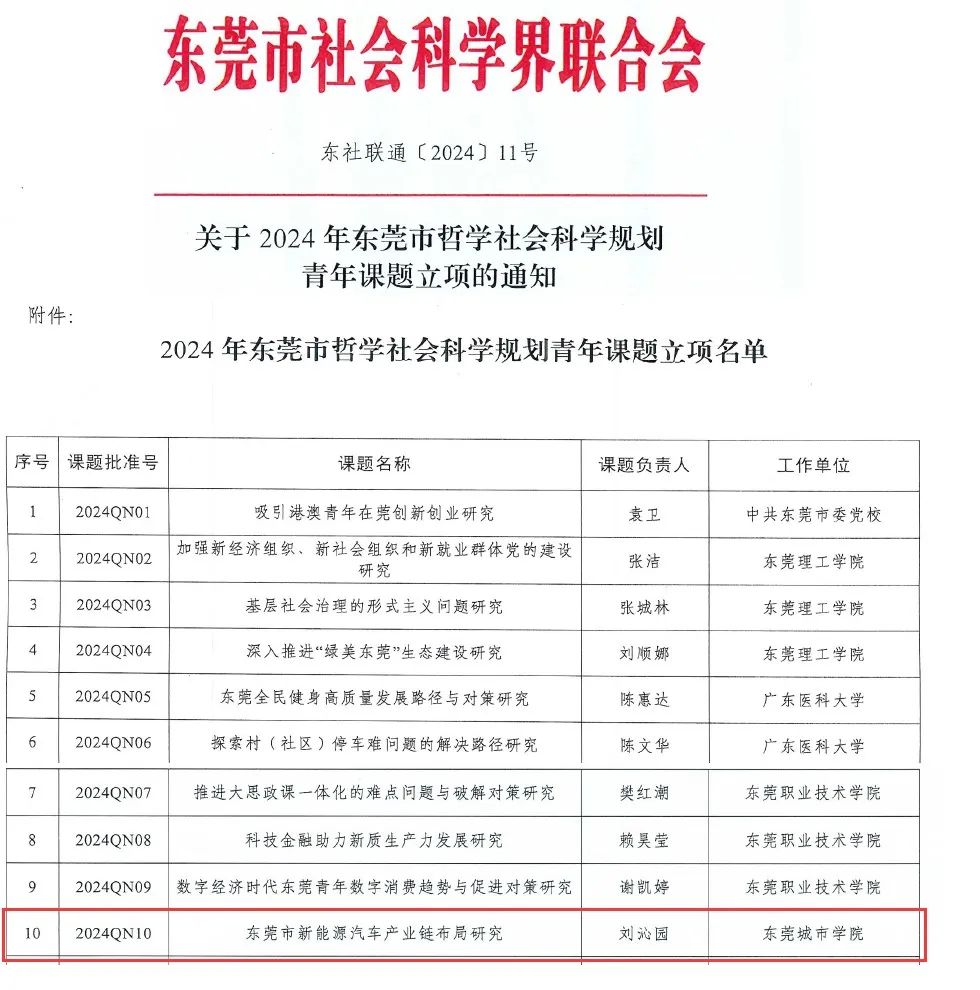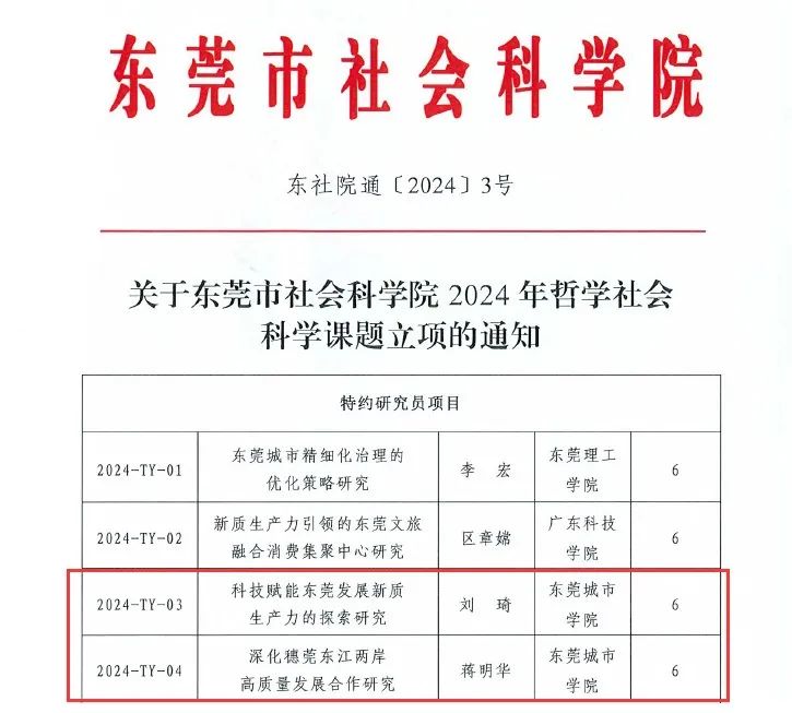 近日,东莞社科联和东莞市社科院分别公布了2024年东莞市哲学社会科学规划课题和东莞市社会科学院2024年哲学社会科学课题立项名单,beat365官网共有13项课题喜获立项,其中特约研究员项目2项,重点资政课题1项,青年课题1项,常规课题9项,获资助经费共计20万元,具体立项名单见下表: