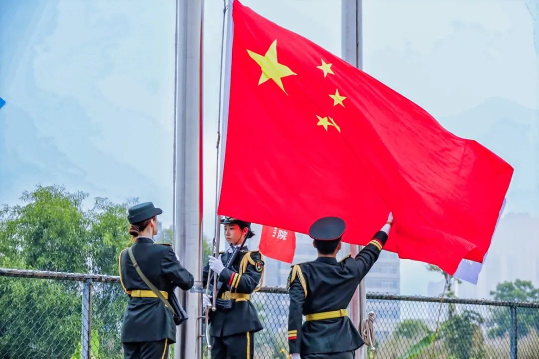 入场完毕,全体起立,高唱中华人民共和国国歌。在庄严的歌声中,全体人员注视着五星红旗冉冉升起。