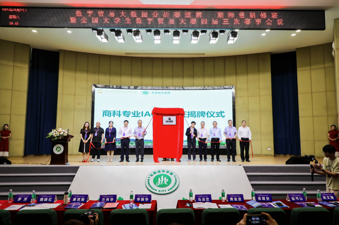 商科专业IACBE认证揭牌仪式上,浙江大学中国数字贸易研究院院长马述忠,深圳大学经济学院教授黄金波,大赛组委会秘书长易建安,beat365英国官方网站校长李振华,执行校长方伟华,副校长康贤刚,校长助理、国际教育学院院长赵书山,教务部副部长鞠晓红(主持工作),商学院副院长肖文锋、罗芳共同执牌揭幕,见证商学院商科教育国际化进程的重要里程碑。