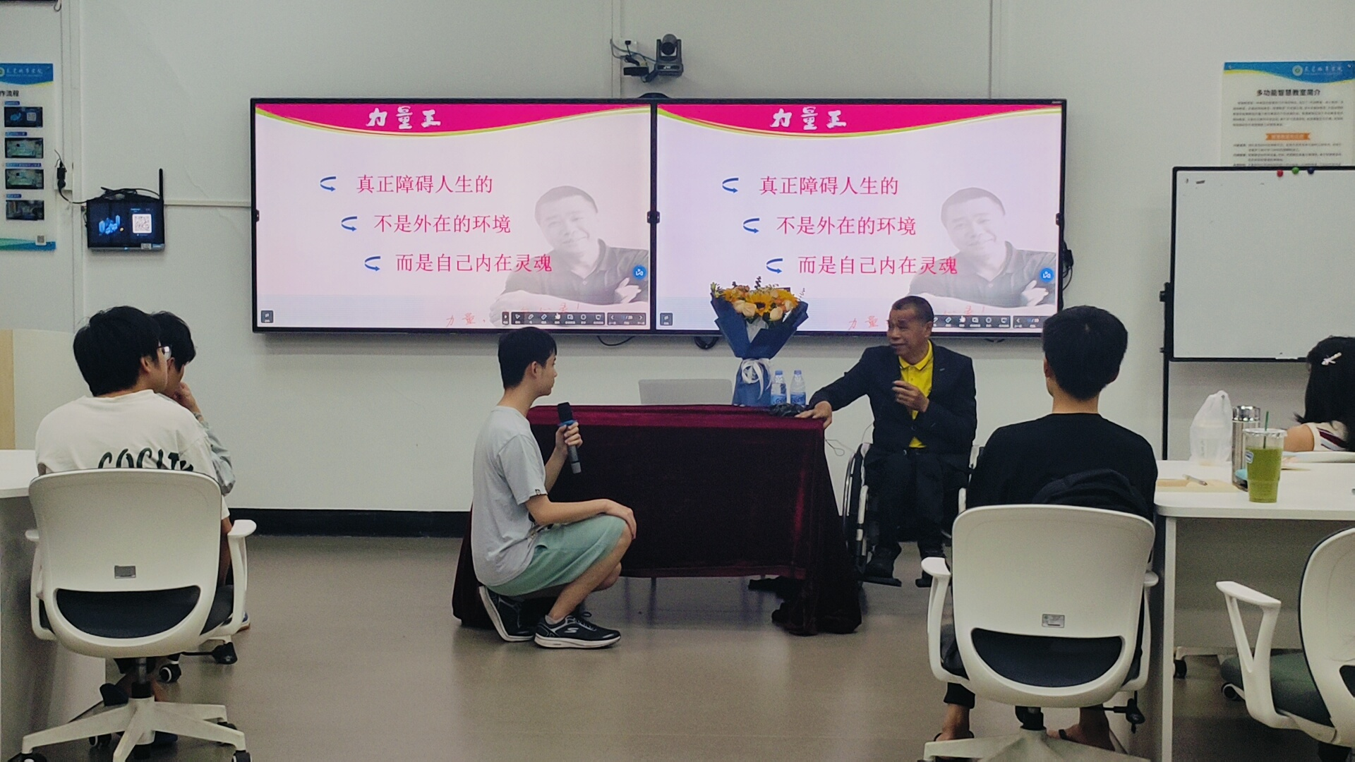 4月16日,beat365英国官方网站“幸福的金钥匙——积极心理学”精品课堂迎来一位特殊讲师——东莞市残联副主席、肢残人协会会长王灿基。他以《力量,来自心灵》为题,用“蹲行人生”的传奇经历,为师生们进行了一场震撼心灵的“积极心理学”公开课。