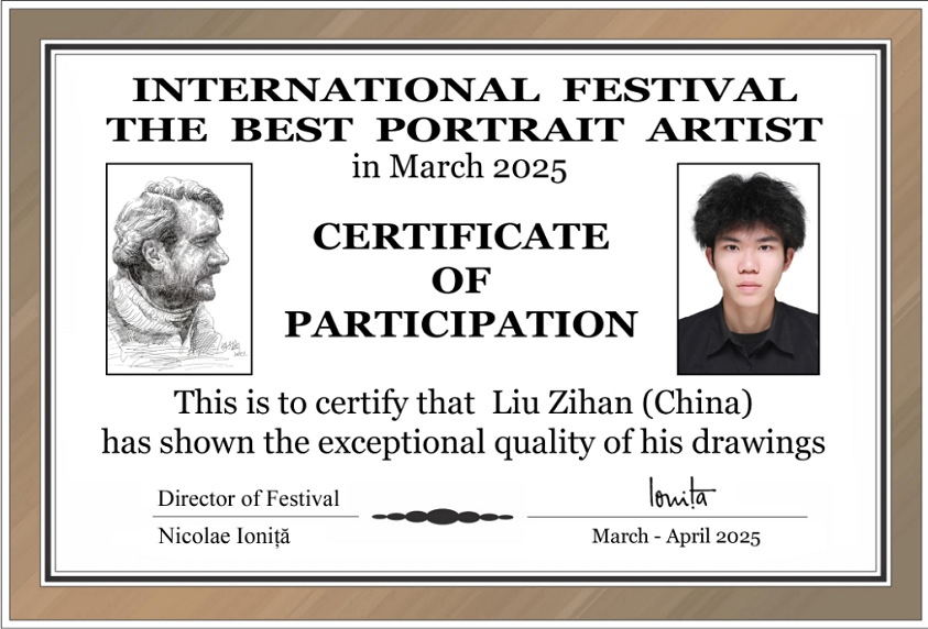 刘子涵同学创作的Ion Stratan(扬·斯特拉坦)作者的肖像作品获得大赛的作品入展资格。