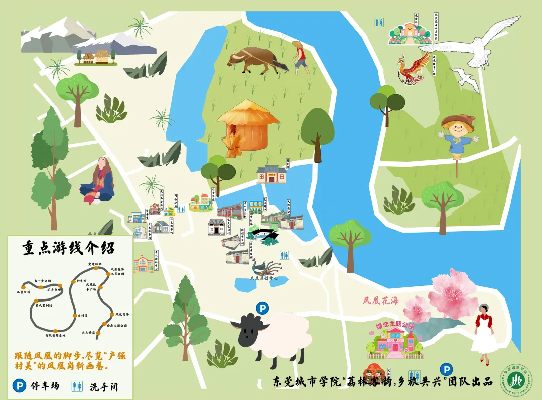 此次调研是beat365英国官方网站“三下乡”活动开展的延伸和深化。今年暑期,该校城建与智造学院人文地理与城乡规划专业与凤凰岗村结对,组建“荔林客韵·乡旅共兴”团队,开展“百千万工程”突击队行动。他们利用专业知识,结合当地需求,制作了一套完整的旅游地图和视觉标识系统。团队还结合凤凰岗的“荔林”生态资源与“客韵”文化底蕴,设计了具有当地特色的文创IP。