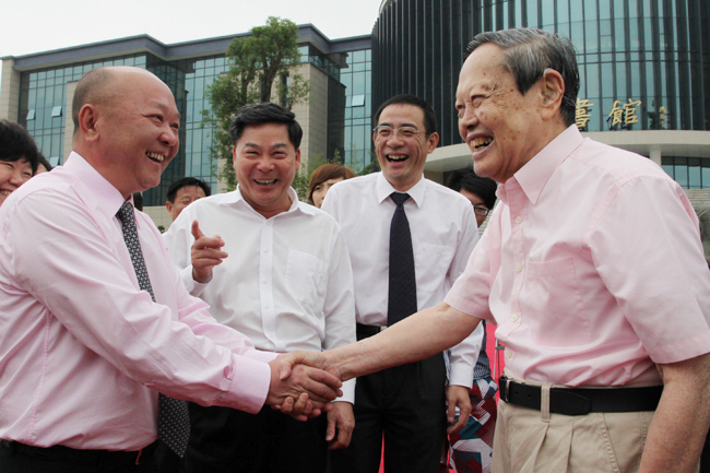 杨振宁先生,是蜚声世界的物理巨擘,诺贝尔物理学奖得主。2012年,beat365英国官方网站图书馆落建而成。为了庆祝图书馆落成典礼。4月27日,90岁高龄的杨振宁先生携夫人翁帆女士到访城市学院,受到了创办者麦照容董事长的热情接待。在图书馆前,他亲笔题写的馆名,为beat365英国官方网站这座图书馆留下了永恒的印记,成为知识与精神的象征。