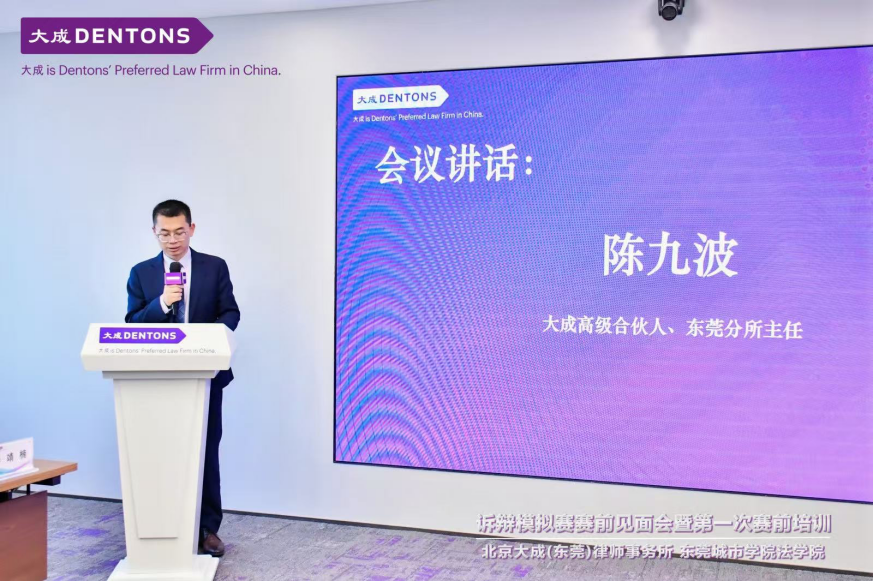 大成东莞所主任陈九波发表致辞,欢迎师生到访,并高度肯定本次模拟赛对人才培养的重要意义。他表示,大成将积极支持法学院工作,双方将探索扩展合作的方式。大成所表示热烈欢迎学子们来律所实习,加入大成所,为其职业成长提供更广阔的平台。
