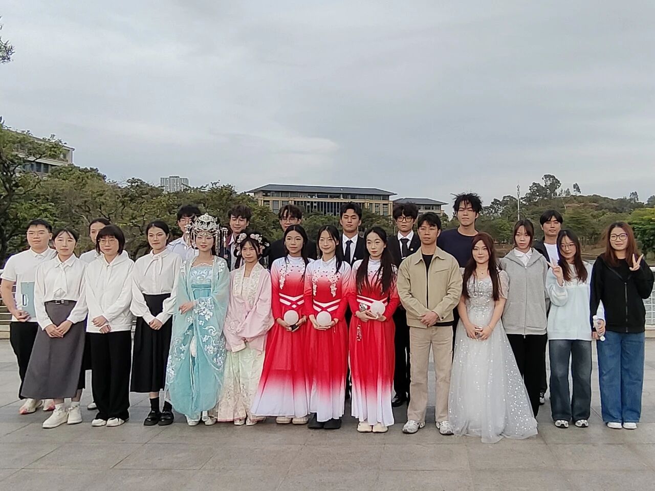 胡桂华、张翅翔、曹懿的集体朗诵《我骄傲,我是中国人》与冉佳妤、古悦铭、刘粤军的《不朽》铿锵有力,抒发了新时代青年的民族自豪与历史担当; 姚书灵、黄颖珊、杨泓哲的讲诵《一声到一生到》以动人叙事展现忠诚信仰; 林圣浩、梁定宇的双人相声《内卷》更以幽默形式引导观众思考奋斗真谛,展现红色精神与时代议题的融合;张祖瑜、黄欣、樊子怡的合唱《我和我的祖国》与冯宝宝、吴卓文的《我爱你中国》将全场情感推向高潮;郭雨初同学独唱《紫荆花盛开》则象征着祖国统一与繁荣的美好愿景。艺术与思政交融,历史与现实对话,展现出新时代青年坚定不移听党话、跟党走的政治自觉。