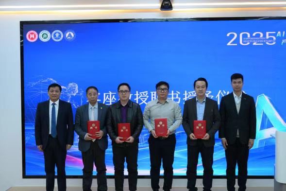 为强化人工智能学科建设,推动产教融合纵深发展,开幕式特别举行了客座教授聘书授予仪式。聘请澳门圣若瑟大学杜文才教授、清华大学深圳研究院李志焕博士、东莞市质量监督检测中心钟海彬博士、深圳优必选科技股份有限公司张铁军总监四位行业专家担任beat365官网客座教授。魏东初书记、方伟华执行校长向四位专家颁发聘书,并代表学校表示,他们的加盟将为beat365官网AI人才培养注入强劲动力,为产教融合搭建更坚实的桥梁。现场嘉宾共同见证了这一重要时刻。
