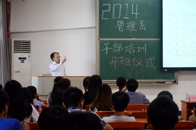 9月4日,管理系“2014管理系学生干部培训班”开班仪式在7C303课室举行。管理系党总支书记帅建华教授、副书记吴春庚老师出席开班仪式。