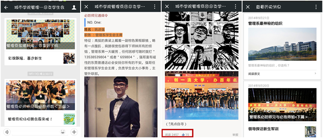 此后,管理系微信公众号陆续推出了针对迎新报到的专题《管理系派福利,你拿到了吗?》,针对团学委员介绍的专题《管理系必防师兄与必泡师姐(上、下篇)》,针对党支部介绍的专题《管理系最神秘的组织》,其中《管理系必防师兄与必泡师姐(上篇)》阅读量接近2500。