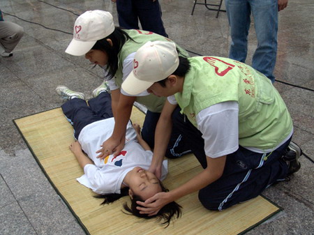 在演练中,同学们学习了头部受伤、左小腿骨折、左上臂悬吊等包扎技术和人工呼吸、心肺复苏、两人扶持、三人平台等震后救治方法。