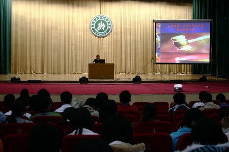 12月13日晚,东莞市人民检察院吴志强科长在学院大礼堂为2006级部分学生讲授《大学生与法律》课。吴科长介绍了检察院的相关职能,并结合案例为同学们讲述了当代大学生应该具备的法律知识。他希望同学们遵纪守法,加强思想道德修养,让大学生活更加美丽。