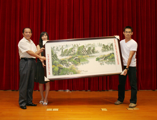 毕业生为了表达对良师益友的依依不舍之情和对新生活的向往,向母校送了山水画和锦旗以谢师恩。