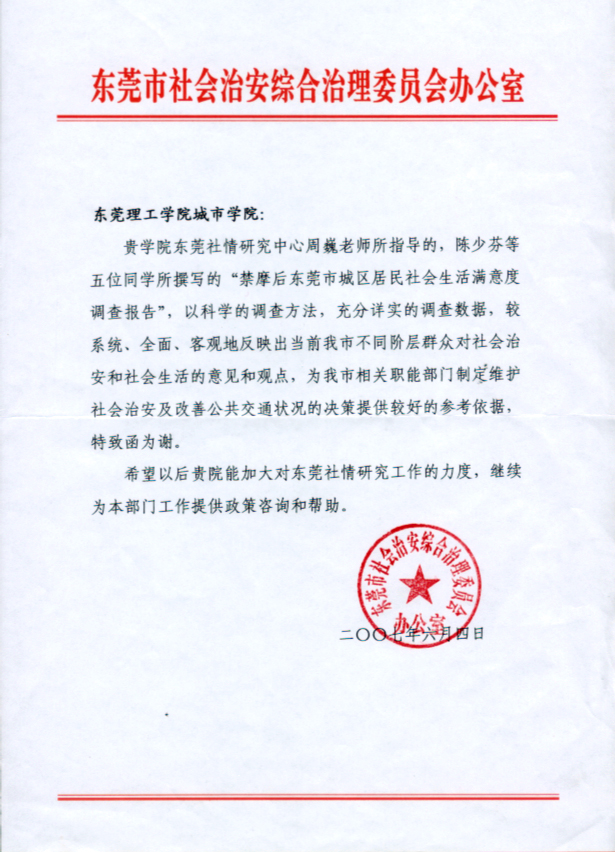 近日,东莞市社会治安综合治理委员会发函我院,对城市学院东莞社情研究中心的工作表示感谢。