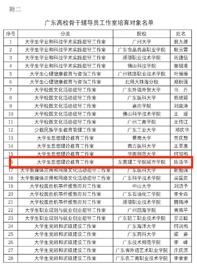 近日,从“广东学工”公众号获悉,我院两个辅导员工作室进入到广东省高校骨干辅导员工作室遴选公示阶段。其中,张宏渝老师的“大学校园文化活动指导工作室”入选“广东高校骨干辅导员工作室建设对象”,陈浩华老师的“大学生思想理论教育工作室”入选“广东高校骨干辅导员工作室培育对象”。这不仅实现了我院建院以来在此领域的新突破,“大学校园文化活动指导工作室”更是广东省独立学院填补了该领域的空白。
