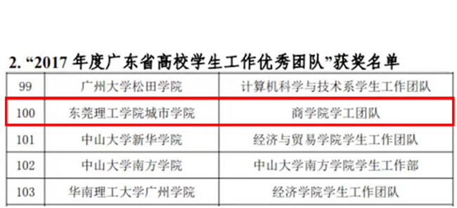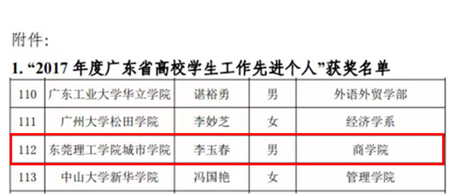 近日,广东省高校学生工作专业委员会公布了2017年学生工作先进个人、优秀团队、第九届学生工作“红棉奖”、第六届“高校学生事务管理精品项目”等奖项获奖名单。我院商学院李玉春荣获“2017年度广东省高校学生工作先进个人”,商学院学工团队荣获“2017年度广东省高校学生工作优秀团队”,宋秋敏、苗琳的“书香文化浸城院,师风国韵诵千秋”项目荣获第六届广东省“高校学生事务管理精品项目”。