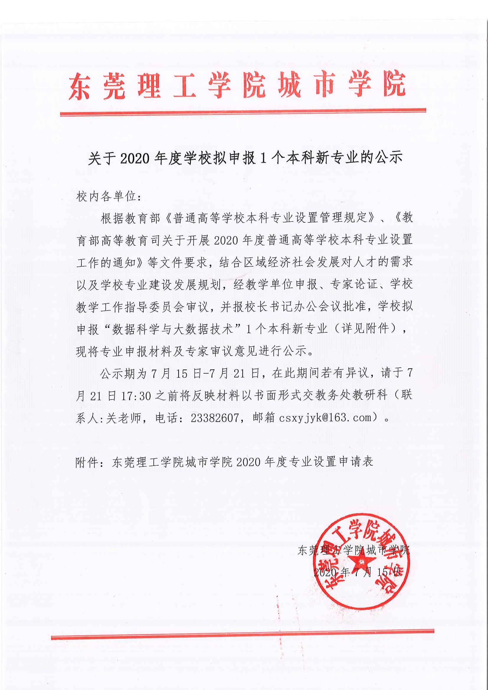 关于2020年度学校拟申报1个本科新专业的公示