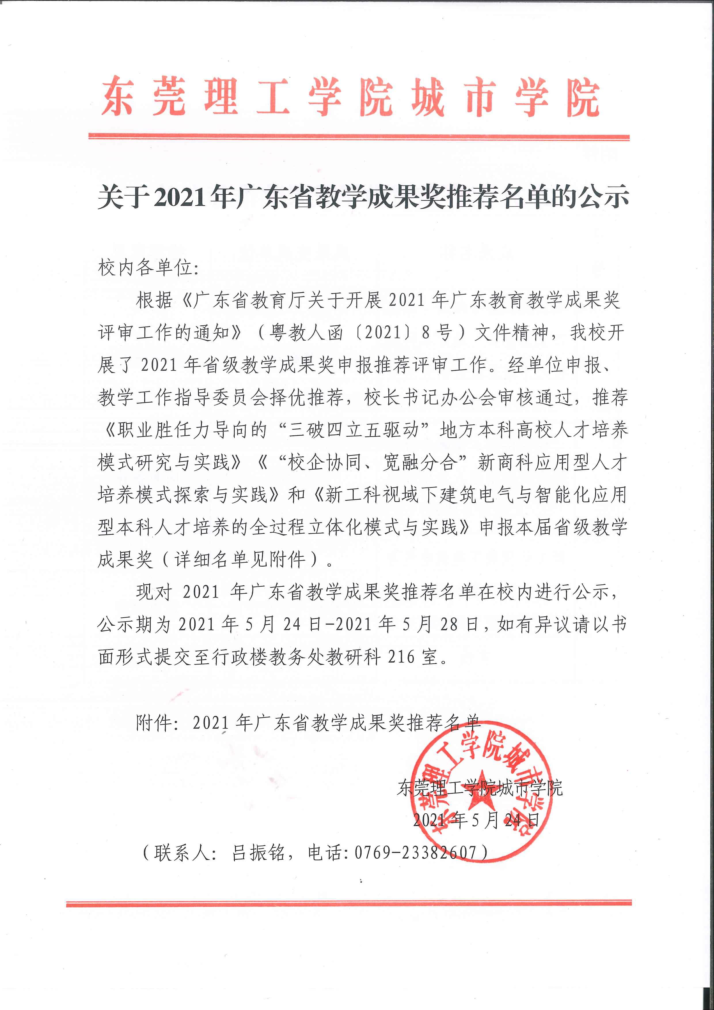 东莞理工学院城市学院关于2021年广东省教学成果奖推荐名单的公示