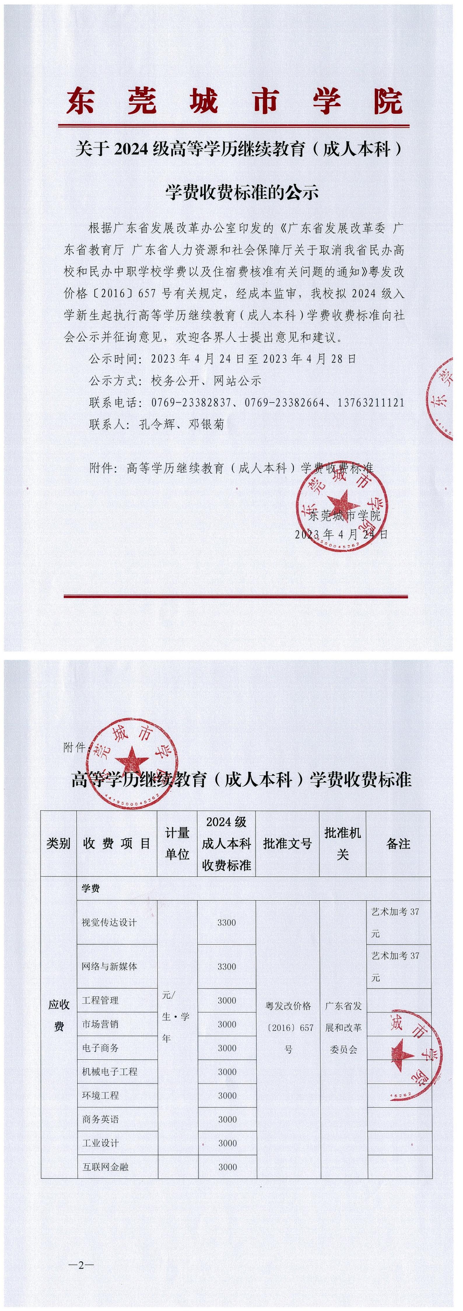 关于2024级高等学历继续教育(成人本科)学费收费标准的公示