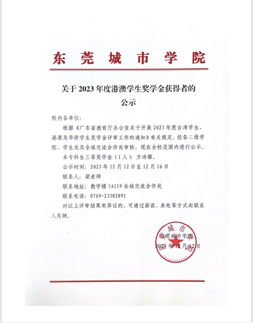 关于2023年度港澳学生奖学金获得者的公示