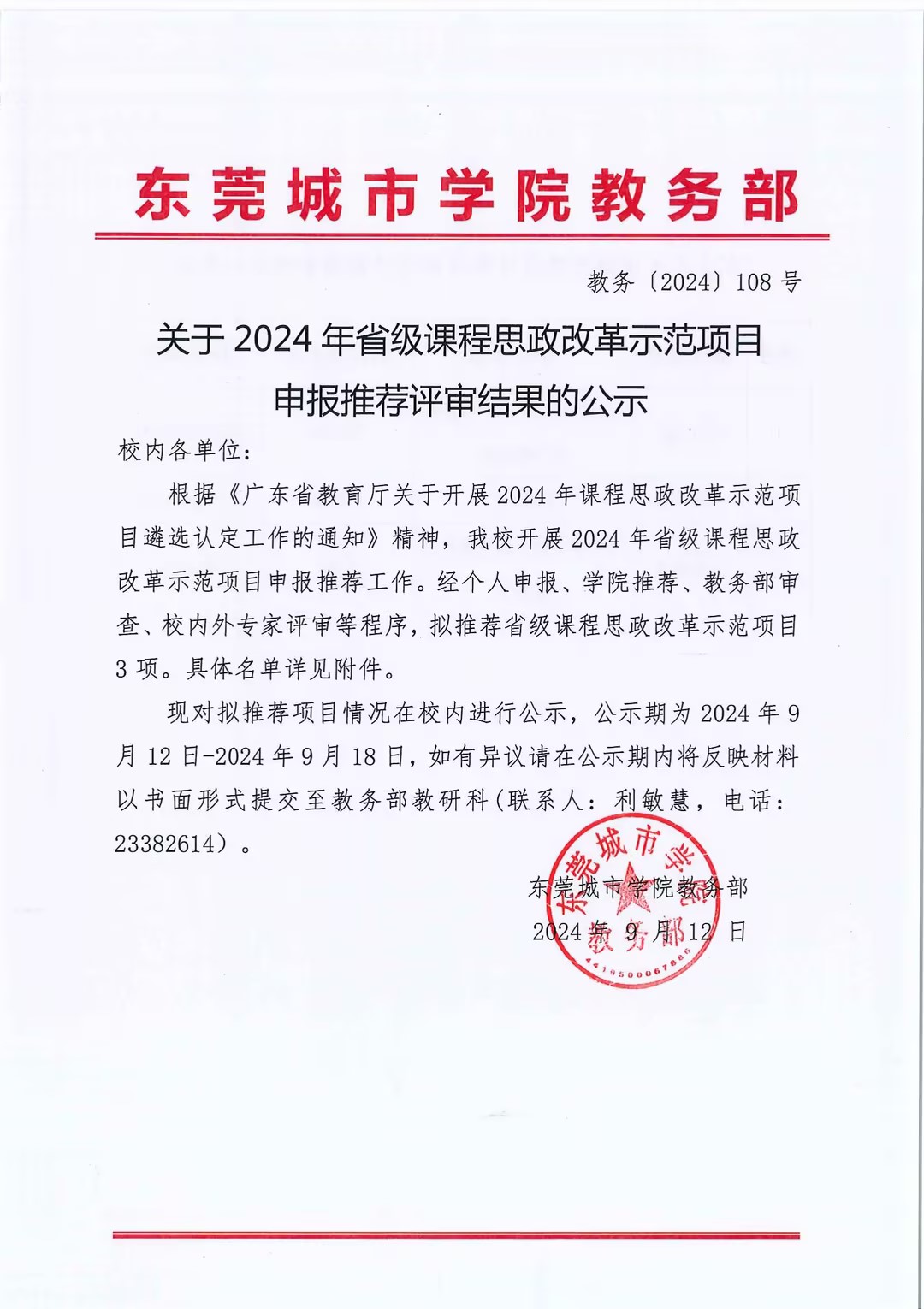 关于2024年省级课程思政改革示范项目申报推荐评审结果的公示