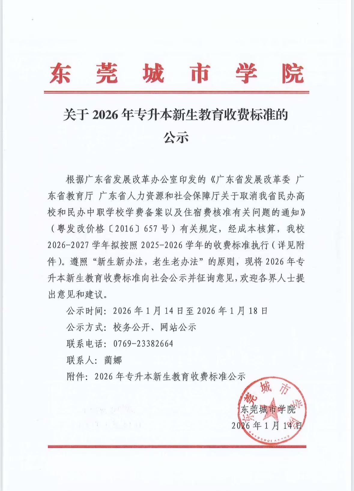 关于2026年专升本新生教育收费标准的公示